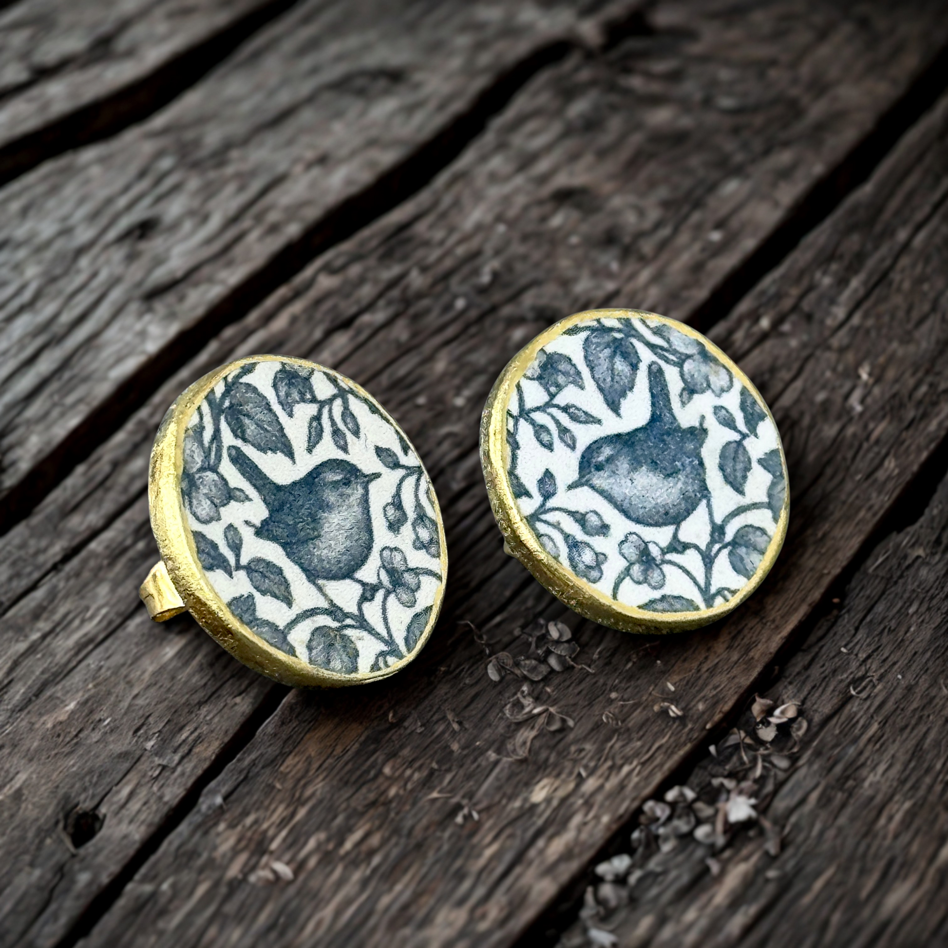 Bring a touch of timeless beauty to your everyday style with these handmade blue bird floral decoupage stud earrings. Each pair is carefully crafted with a vintage-inspired bird and botanical motif, delicately framed in a shimmering gold border. Perfect for nature lovers, bird enthusiasts, and anyone who appreciates unique artisan jewellery.